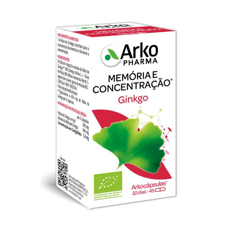 [CIRCULAÇÃO, MORAL E MEMÓRIA] Suplemento alimentar à base de Ginkgo que contribui para a manutenção da normal microcirculação sanguínea, da memória e para favorecer o desempenho cognitivo. Através da sua experiência na área da fitoterapia, os laboratórios Arkopharma reuniram 100% dos princípios ativos do Ginkgo, que atuam de forma sinérgica, respeitando ao máximo o seu organismo. Contém por cápsula 40 mg de extrato da folha de Gingko (Gingko biloba L.). Tomar 2 cápsulas por dia, 1 cápsula ao pequeno-almoço e 1 cápsula ao jantar, com um copo de água.
