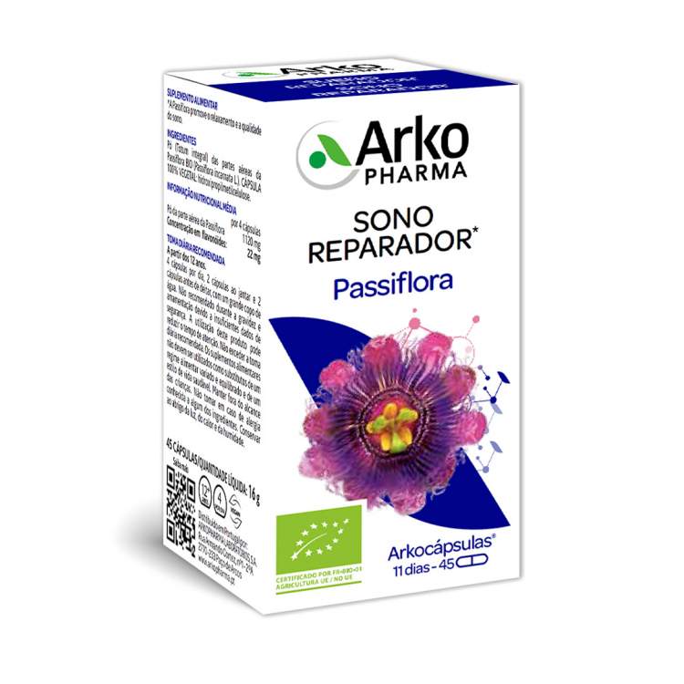 [SONO E STRESS] Suplemento alimentar à base de Passiflora que contribui para a qualidade do sono, ajuda no relaxamento e na tranquilidade. Contém por cápsula: 300 mg de pó integral criotriturado das partes aéreas da Passiflora (Passiflora incarnata L.) com um teor mínimo de 1,5% de flavonóides totais (expressos em vitexina). Tomar 3 cápsulas por dia: 1 ao jantar e 2 antes de deitar,