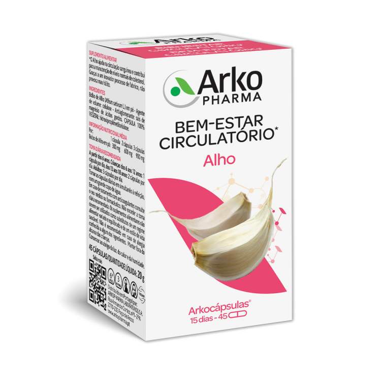 [CIRCULAÇÃO, METABOLISMO] Suplemento alimentar de Alho que ajuda na circulação sanguínea e contribui para a manutenção dos níveis normais do colesterol. O seu inovador processo de fabrico conseguiu travar o processo enzimático natural, obtendo cápsulas de Alho pulverizado sem cheiro, que não provocam mau hálito. Cada cápsula contém 300mg de bolbo de Alho pulverizado (Allium sativum L.). Tomar 3 cápsulas por dia: 1 ao pequeno-almoço e 2 ao jantar.