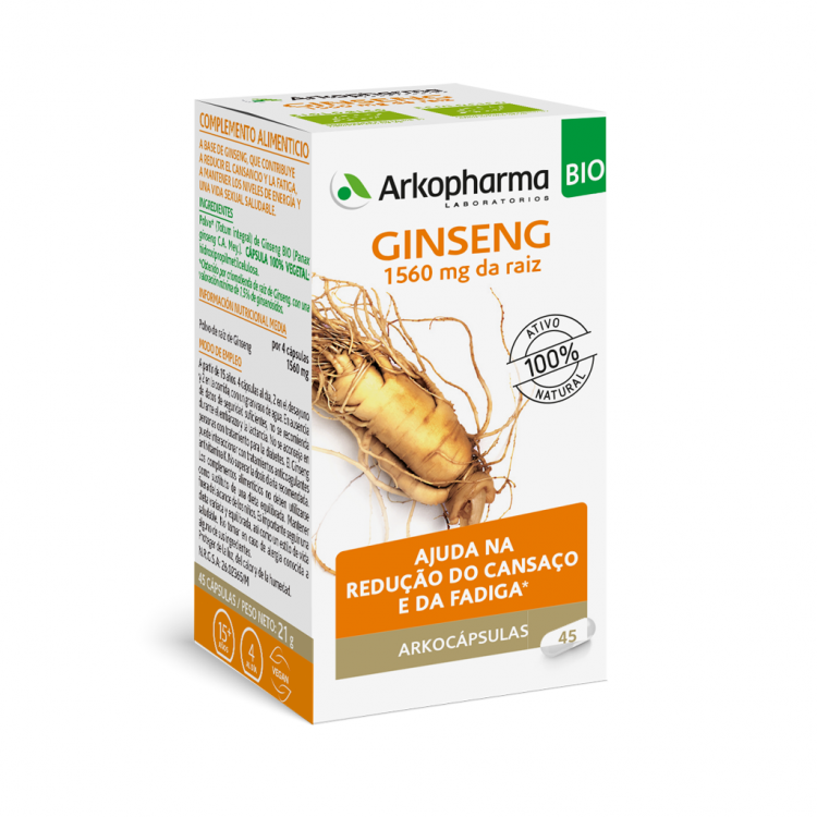 [FADIGA E ENERGIA] Suplemento alimentar à base de Ginseng que contribui para a redução do cansaço e da fadiga, para manter os níveis de energia e para uma vida sexual saudável. Cada cápsula contém 390 mg/cápsula de pó integral criotriturado da raiz de Ginseng (Panax ginseng C.A. Mayer) com um teor mínimo de 0,4% de ginsenósidos Rb1+Rg1. Tomar 4 cápsulas por dia, 2 cápsulas ao pequeno-almoço e 2 cápsulas ao almoço, com um grande copo de água.
