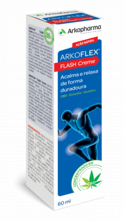 ARKOFLEX® FLASH Creme permite uma massagem fácil e eficaz nas áreas desejadas, graças à sua fórmula hidratante e rápida absorção. É composto por uma fórmula completa, concentrada em CBD (Canabidiol), ativo da Cannabis sativa L. Contém também Gaultéria, Arnica e Boswellia. O efeito frio proporciona um alívio imediato; o efeito quente proporciona uma sensação relaxante, que perdura no mínimo 40 minutos, reforçando os benefícios da massagem. Aplicar 1 ou 2 nozes do creme, nas zonas desejadas, até completa absorção. Repetir a aplicação, massajando a área, 2-3 vezes por dia.