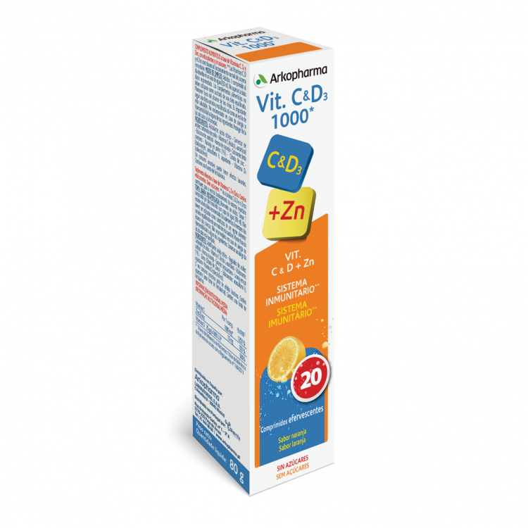 [FADIGA, ENERGIA E DEFESAS] Suplemento alimentar à base de Vitamina C e Zinco, sem açúcares. A Vitamina C e o Zinco contribuem para o normal funcionamento do sistema imunitário e para a proteção das células contra as oxidações indesejáveis. Adicionalmente, a Vitamina C contribui para a redução do cansaço e da fadiga. Composição por 1 comprimido: 1000mg de Vitamina C, 10mg de Zinco e 25mcg de Vitamina D. Reservado ao Adulto. Tomar 1 comprimido por dia dissolvido num copo de água (250 ml).