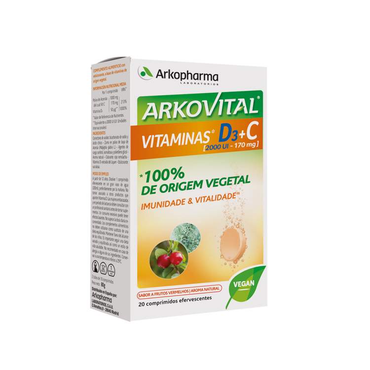 [FADIGA, ENERGIA E DEFESAS] Suplemento alimentar com um duo de vitaminas de origem vegetal altamente concentrado que ajudam a reforçar a imunidade, reduzem o cansaço e fadiga e contribuem para a manutenção óssea. Contém 2000 UI de Vitamina D3, proveniente do Líquen, e 170 mg de Vitamina C, proveniente da Acerola, que atuam em conjunto para o normal funcionamento do sistema imunitário. Indicado a partir dos 12 anos. Dissolver 1 comprimido efervescente num grande copo de água (200ml), de preferência de manhã.