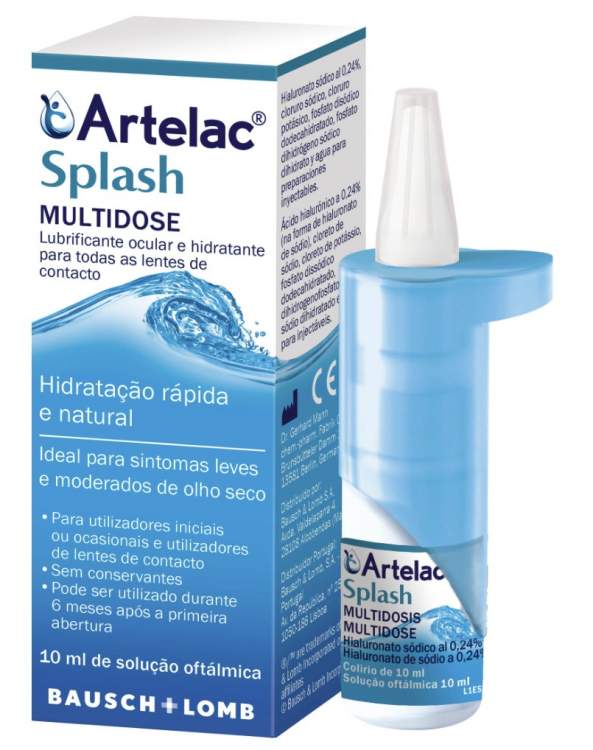 Colírio hidratante natural para acalmar e hidratar instantaneamente os olhos secos. Refresca e acalma de maneira natural a secura ocular e alívia os sintomas de olhos cansados, com tensão ou lacrimejantes. Artelac® Splash pode ser também utilizado para hidratar ou re-hidratar as lentes de contacto, tanto flexíveis como rígidas, quando colocadas, e melhora consideravelmente a sensação de conforto durante todo o dia. Aplique uma gota de Artelac® Splash no olho sempre que necessite. Pode utilizá-lo todos os dias e com a frequência que deseje. Não há limitação sobre a duração de utilização.