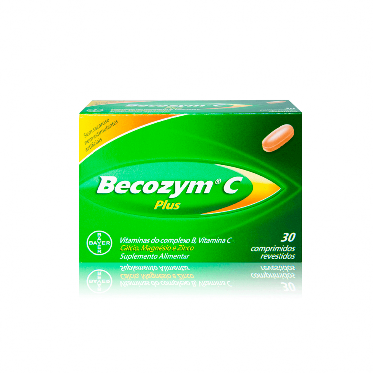 Becozym® C Plus é um suplemento alimentar diário que contém uma combinação específica de vitaminas do complexo B, vitamina C, Cálcio, Magnésio e Zinco. Estes nutrientes essenciais, atuam em conjunto e são vitais para o funcionamento normal do organismo: a vitamina C e o Zinco contribuem para o normal funcionamento do sistema imunitário; o magnésio contribui para o normal funcionamento muscular e do sistema nervoso, e o ácido pantoténico (vitamina B5) contribui para a redução do cansaço e da fadiga e de um desempenho mental normal. Os suplementos alimentares não devem ser utilizados como substitutos de um regime alimentar variado, equilibrado e de um modo de vida saudável. Composição: Vitaminas B1, B2, B3, B5, B6, B7, B9, B12 e C, cálcio, magnésio e zinco. Posologia: 1 comprimido por dia com um pouco de líquido, preferencialmente de manhã.