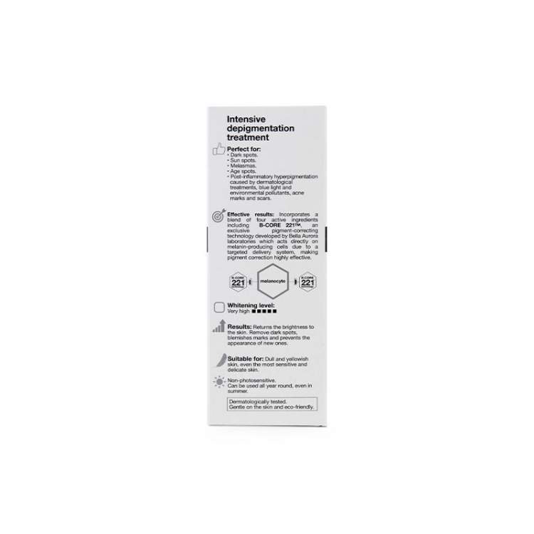 Tratamento intensivo antimanchas com a exclusiva tecnologia despigmentante B-CORE221™. Um sistema de encapsulação e libertação dirigida que permite atuar diretamente sobre as células produtoras de melanina, libertando aí, de forma precisa e integral, o seu princípio ativo despigmentante, para obter assim a máxima eficácia. • Ação despigmentante mais rápida e eficaz, que atua diretamente no interior dos melanócitos. • Previne o aparecimento de novas manchas, inibindo a produção de melanina. • Antioxidante, neutraliza os radicais livres e clareia o tom das manchas existentes. • Protege contra a agressão externa dos contaminantes ambientais e contra a radiação UV, evitando a formação de possíveis manchas. Hipoalergénico. Testado sob controlo dermatológico. Respeitoso com a pele e com a natureza. Peles preocupadas pelas manchas escuras, solares, hormonais ou melasmas, lentigos senis, marcas pós-inflamatórias causadas por tratamentos dermatológicos, luz azul, contaminantes ambientais, marcas de acne e cicatrizes.