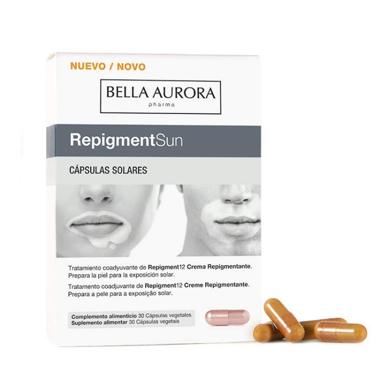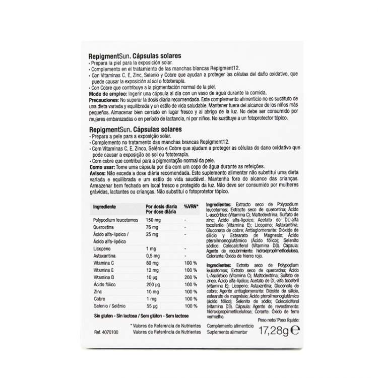 REPIGMENTSUN Cápsulas solares Cápsulas solares que ajudam a preparar a pele para a exposição solar no tratamento cosmético específico para mitigar as consequências estéticas do vitiligo sobre a pele. Inovação: Com Vitaminas C e E, zinco, selénio e cobre, que ajudam a proteger as células do dano oxidativo que a exposição ao sol ou a fototerapia podem causar. Com cobre, que contribui para a pigmentação normal da pele. Posologia: Tomar uma cápsula por dia com um copo de água durante o almoço. - Não superar a dose diária recomendada. Este complemento alimentar não substitui uma dieta variada e equilibrada, nem um estilo de vida saudável. Manter fora do alcance das crianças mais pequenas. Armazenar bem fechado num lugar fresco e protegido da luz. Não se recomenda o seu consumo durante a gravidez ou a amamentação, nem por crianças. Não substitui um fotoprotetor tópico.