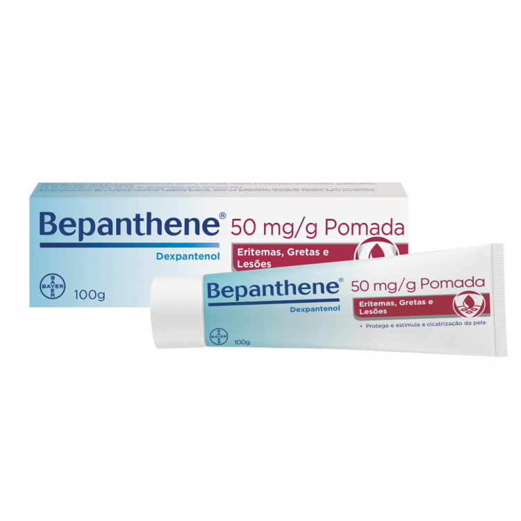 Bepanthene Pomada cuida da pele ao formar uma camada protetora na superfície da pele, protegendo-a em situações de contacto com substâncias irritantes, uma vez que evita a perda de água, proporcionando uma hidratação profunda. Ajuda ainda a estimular a cicatrização da pele e está indicado no tratamento de feridas e inflamações dos mamilos, tratamento do eritema da fralda, hidratação da pele e lábios secos, irritados, ásperos ou gretados, cicatrizes recentes, úlceras e feridas dos acamados ou irritações e lesões após radioterapia ou UV. Bepanthene Pomada contém dexpantenol (5%), também conhecido como provitamina B5 e um alto teor lipídico (60%), que protegem, cuidam, estimulam a regeneração da pele e proporcionam uma hidratação profunda. Não contém conservantes, corantes nem perfume.