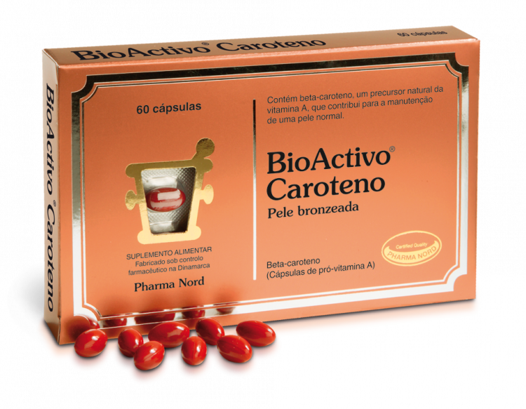 BioActivo Caroteno contém 9 mg de beta-caroteno puro e natural (equivale a 4 cenouras grandes). O beta-caroteno é misturado numa matriz de óleo que se mantém estável e garante uma boa biodisponibilidade. Contribui para a manutenção de uma pele normal, visão, membranas mucosas, normal função do sistema imunitário e para o bronzeamento da pele.