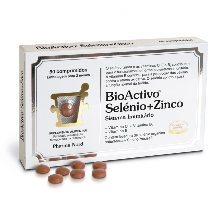 Suplemento alimentar com levedura de selénio orgânico (SelenoPrecise), zinco e vitaminas C, E e B6, que contribui para o normal funcionamento do sistema imunitário, da glândula tiróide, normal função psicológica e protege as células contra o stress oxidativo. O BioActivo Selénio+Zinco contém 100 µg da levedura pantenteada da Pharma Nord, enriquecida com selénio orgânico de elevada absorção - SelenoPrecise. Esta levedura contém 67% de L-selenometionina e 33% de outras formas diferentes de selénio, o que corresponde à variedade natural que se consome numa alimentação equilibrada e rica em selénio. O selénio presente no comprimido é absorvido até 89%. A absorção e o efeito do selénio parece ser reforçado quando combinado com as vitaminas C, E, B6 e zinco. Composição: 90mg de Vitamina C, 15mg de Vitamina E, 2mg de Vitamina B6, 15mg de Zinco e 100 mcg de Selénio. Posologia: Tomar 1 comprimido por dia, à refeição, ou segundo indicação do médico. Fabricado sob controlo farmacêutico na Dinamarca.