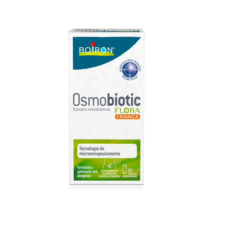 Osmobiotic Flora Criança, formulado com 1.5 biliões de Lactobacillus casei e Bifidobacterium breve, destina-se a crianças que sofrem de dores abdominais relacionadas com episódios de diarreia e / ou obstipação, com necessidade de reequilibrar a flora intestinal. Promove o bem-estar gastrointestinal e reforça o sistema imunitário. Para evitar a degradação das estirpes microbióticas em contato com a acidez gástrica, foi desenvolvida uma tecnologia de microencapsulamento. Consiste em revestir as estirpes com uma fina camada lipídica para que resistam à humidade e aos sucos presentes no estômago. Assim, um maior número de estirpes microbióticas chegam viáveis ??ao intestino. Graças à implementação do processo patenteado da Probiotical, a Boiron garante a ausência de alérgenos* na composição dos suplementos alimentares da Osmobiotic® Flora. Sabor a framboesa.