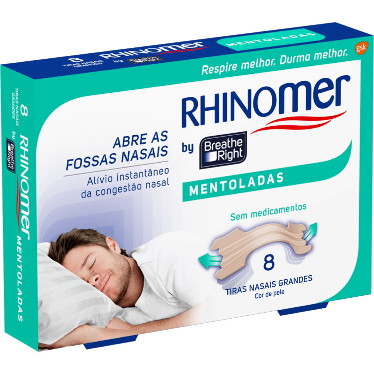Rhinomer by Breathe Right Mentoladas são tiras nasais revestidas com cápsulas que contêm mentol, eucalipto e cânfora. Ao abrirem as fossas nasais, as tiras nasais Rhinomer by Breathe Right melhoram o fluxo de ar, permitindo um alívio instantâneo da congestão nasal. As tiras nasais Rhinomer by Breathe Right não contêm medicamentos e está clinicamente comprovado que ao abrirem as fossas nasais permitem respirar 31% mais de ar. As tiras Rhinomer by Breathe Right são duas bandas plásticas flexíveis patenteadas. O adesivo especial permite que a tira se ajuste comodamente sobre as abas do nariz e a sua ação de flexão permite que as bandas elevem as fossas nasais abrindo e mantendo os canais nasais abertos. As tiras Rhinomer by Breathe Right podem ser usadas de dia ou à noite para o alívio de congestão nasal, devido a alergias, constipações, ressonar, ou desvio do septo, mas não devem ser usadas mais de 12h por dia.