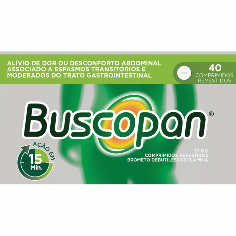 Medicamento não sujeito a receita médica indicado para o alívio da dor de barriga, espasmos ou desconforto abdominal causados por exemplo por stress ou síndrome do intestino irritável. A sua fórmula permite uma ação rápida (em 15 minutos) na origem da dor, sem grande absorção na corrente sanguínea, com boa tolerância e baixa incidência de efeitos adversos. Adequado para adultos e crianças com mais de 6 anos. Contém 10mg de Brometo de butilescopolamina. Em caso de dores mais fortes, existe também o Buscopan Compositum N com 500mg de Paracetamol.