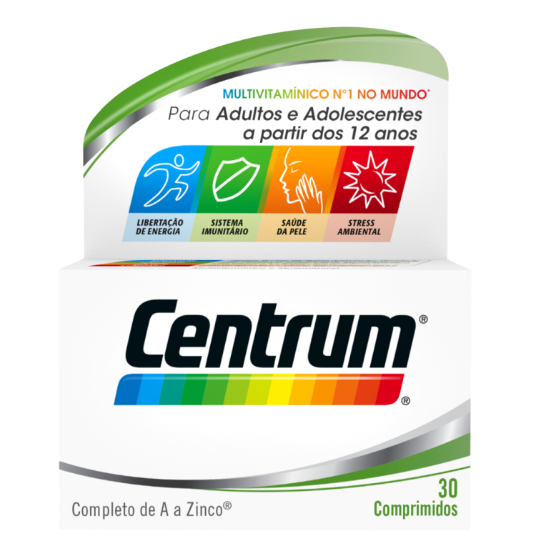 Centrum é um suplemento alimentar com vitaminas e minerais, numa fórmula especialmente equilibrada e completa. Para adultos e adolescentes a partir dos 12 anos. A fórmula multivitamínica de Centrum contém uma proporção equilibrada de todas as vitaminas essenciais além de minerais importantes e oligoelementos. Proporciona múltiplos benefícios: contribui para o normal metabolismo produtor de energia e normal funcionamento do sistema imunitário, ajudam na manutenção de uma pele normal e contribui também para proteção contra o stress ambiental. Tome 1 comprimido diariamente, juntamente com alimentos e com auxílio de líquidos. O comprimido pode ser engolido inteiro ou dividido em duas metades se necessário. Pode tomar por longos períodos para ajudar a complementar a sua alimentação.
