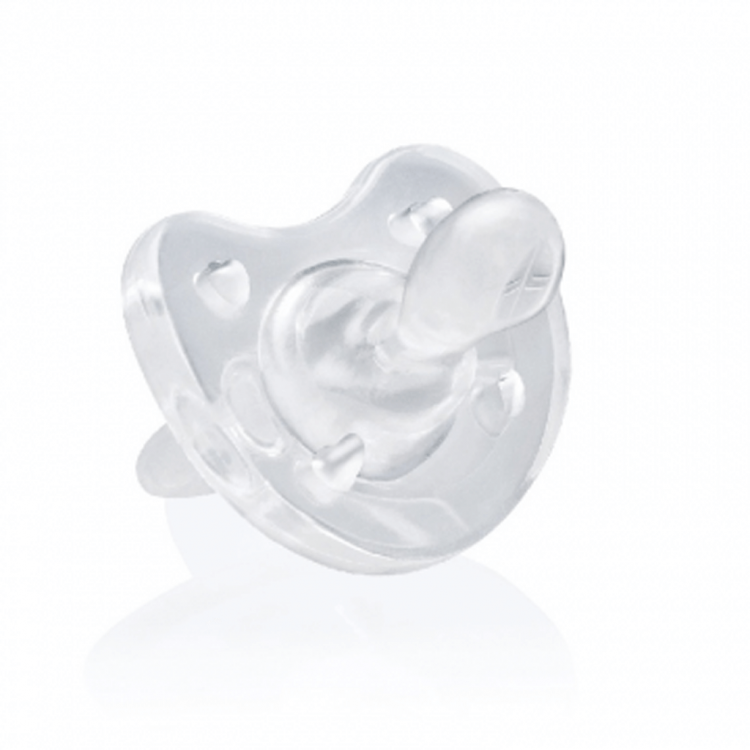 Embalagem com 1 chupeta de silicone. Cor: Transparente. 12M+.