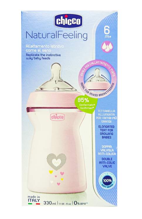 Uma linha de biberões que acompanha o desenvolvimento do bebé, adequando-se às diferentes fases do seu crescimento. Natural Feeling 6m+ 330ml Fluxo Rápido simula a forma natural do movimento de sucção do bebé, como no seio materno. A tetina de silicone extra macia “Efeito mamã” garante uma sensação natural durante a sucção, e uma transição fácil entre o seio e o biberão. A forma alongada e a base ligeiramente arredondada da tetina foi especialmente desenvolvida para a fase que se inicia aos 6 meses de idade. A tetina de fluxo rápido é ideal para os bebés que têm um apetite maior, e garante uma pega confortável para uma sucção com os lábios mais fechados. A dupla válvula anticólicas previne a ingestão de ar, reduzindo o risco de cólicas e regurgitação. Formato ergonómico, fácil de segurar. 0%BPA. Todos os componentes são compatíveis com os biberões NaturalFeeling.