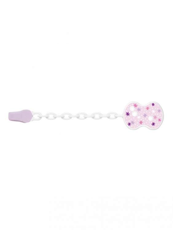 Embalagem com 1 clip com corrente, para chupeta, de cor rosa.