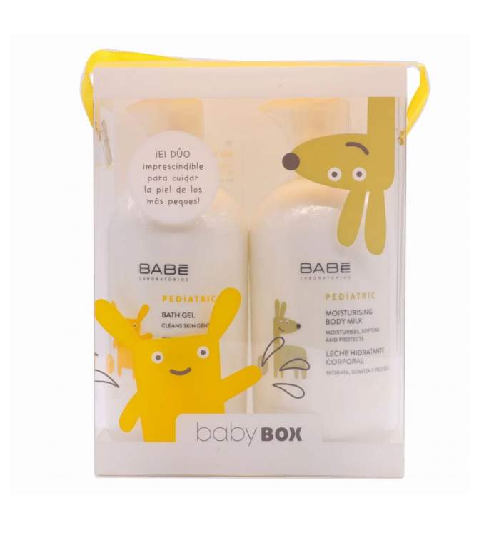 Babé Pediatric apresenta-lhe a Baby Box um pack com 2 essenciais para todo o bebé ou criança! BABÉ PEDIATRIC GEL DE BANHO - Gel de banho suave, perfeito para a higiene diária do seu bebé. Não irrita os olhos. Fórmula especialmente indicada para peles delicadas, respeita e mantém a camada protetora e a hidratação da pele. Contém calêndula, mimosa e aloe vera. pH 6 - Alta tolerância cutânea. BABÉ PEDIATRIC LEITE HIDRATANTE CORPORAL - Loção corporal ideal para o cuidado diário da pele do seu bebé. Hidrata, suaviza e protege a pele. Textura de rápida absorção. Fórmula enriquecida com complexos hidratantes, anti-inflamatórios, regeneradores e calmantes. pH 6 - Alta tolerância cutânea.