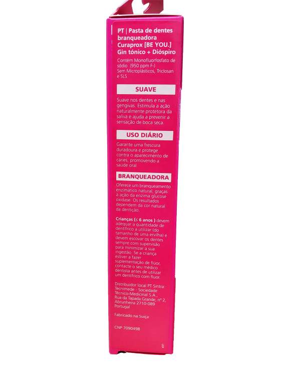 Gin Tónico + Dióspiro – Para uma escovagem sofisticada Um doce dióspiro. Um toque de baga de zimbro. Toda a diversão trazida pelo gin tónico, mas sem álcool. Pronto para encarar os desafios do dia. Be you. A fórmula - frescura, extractos de plantas, saúde oral . O flúor é indispensável na prevenção de cáries. A hidroxilapatite e a glucose oxidase, juntamente com os seus ingredientes naturais, asseguram um efeito branqueador enzimático que é suave nos teus dentes. O xilitol, para além de conferir um sabor agradável, fortalece os teus dentes e combate as bactérias. Extratos de equinácea, laranja amarga, unha do diabo e erva-doce indiana que apoiam as tuas membranas mucosas e param a inflamação. Como se não bastasse, a provitamina B5 suporta a formação de novas células. Sem LSS, sem triclosan, sem microplásticos. RDA aproximadamente 50. As fragrâncias contêm uma generosa dose de mentol.