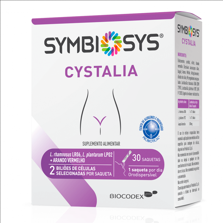 Symbiosys Cystalia combina estirpes selecionadas, L.rhamnosus LR06 e L.plantarum LP02, com extrato de arando, para manter o equilíbrio do sistema urinário em caso de desconforto urinário persistente.