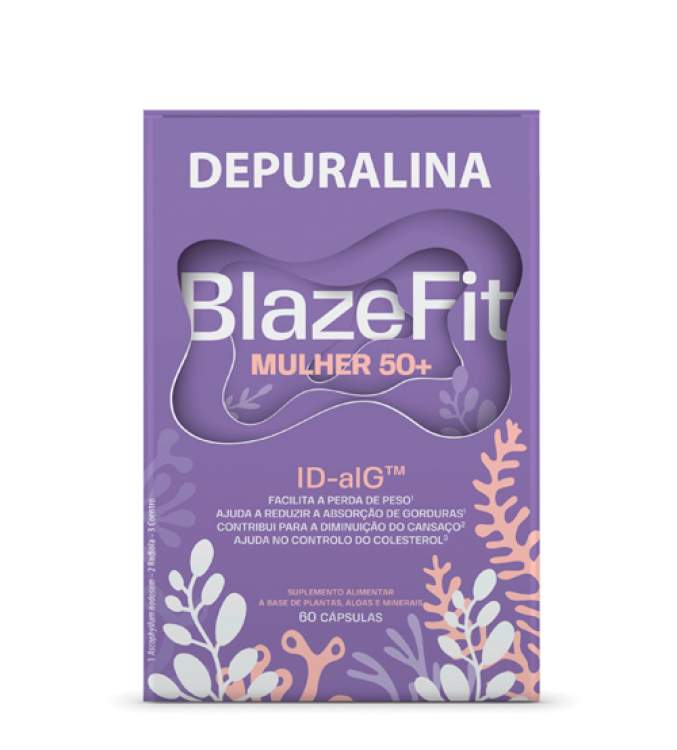 Depuralina Blaze Fit Mulher 50+ é um suplemento alimentar que facilita a perda de peso, ajuda a reduzir a absorção de gorduras e a controlar o colesterol, ao mesmo tempo que diminui o cansaço. A sua fórmula está especialmente concebida para proporcionar bem estar durante e depois da menopausa, reduzindo os sintomas usuais como os calores e suores. Tomar 4 cápsulas por dia, 2 cápsulas meia hora antes do almoço e 2 cápsulas meia hora antes do jantar.
