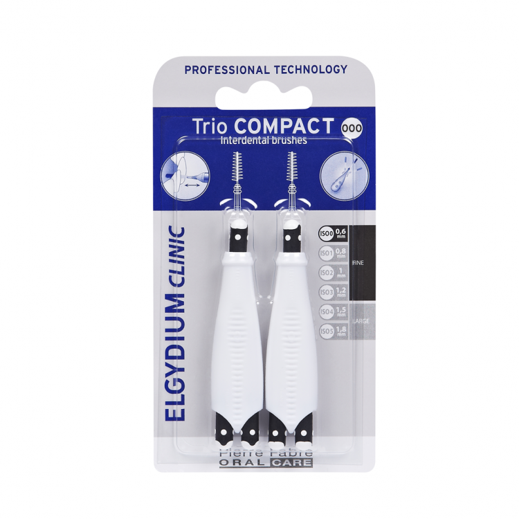 ELGYDIUM CLINIC ESCOVILHÃO TRIO COMPACT é o único sistema compacto e prático que combina três escovilhões num único cabo. Disponível em seis tamanhos diferentes. Cada tamanho tem uma cor correspondente, com diâmetro de arame específico (entre 0,38 e 0,80 mm) e diâmetro de cerdas específico (entre 1,9 e 8 mm) para se adaptar a todos os tamanhos dos espaços interdentários. Cinco versões disponíveis com uma escolha de escovilhões de um único tamanho ou mistos, com vários tamanhos.Têm ainda cerdas bicolores: brancas para revelar as gengivas sensíveis em caso de sangramento, e pretas, mais finas, para facilitar a inserção da escova e visualizar a eliminação da placa bacteriana.