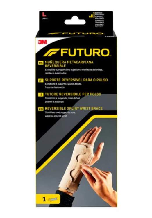 O Suporte de Pulso com Tala Reversível FUTURO™ proporciona suporte confortável e estabilizador para lesões comuns, tais como entorses, luxações e sintomas da Síndrome do Canal Cárpico*. Este suporte de pulso inclui um estabilizador palmar para apoio adicional e um design prático da manga para pôr e tirar facilmente. Estas tiras ajudam a conseguir o nível de compressão e suporte pretendido e o design permite manter a mobilidade total dos dedos. Sinta a facilidade de utilização do Suporte de Pulso com Tala Reversível FUTURO™. Ideal para: Suporte para lesões comuns, como entorses, distensões e sintomas da Síndrome do Canal Cárpico. O estabilizador palmar ajuda a proporcionar estabilidade moderada. Pode ser usado no pulso esquerdo ou direito. Utilização prevista: Proporcionar suporte de pulso rígido, fraco ou lesionado,
