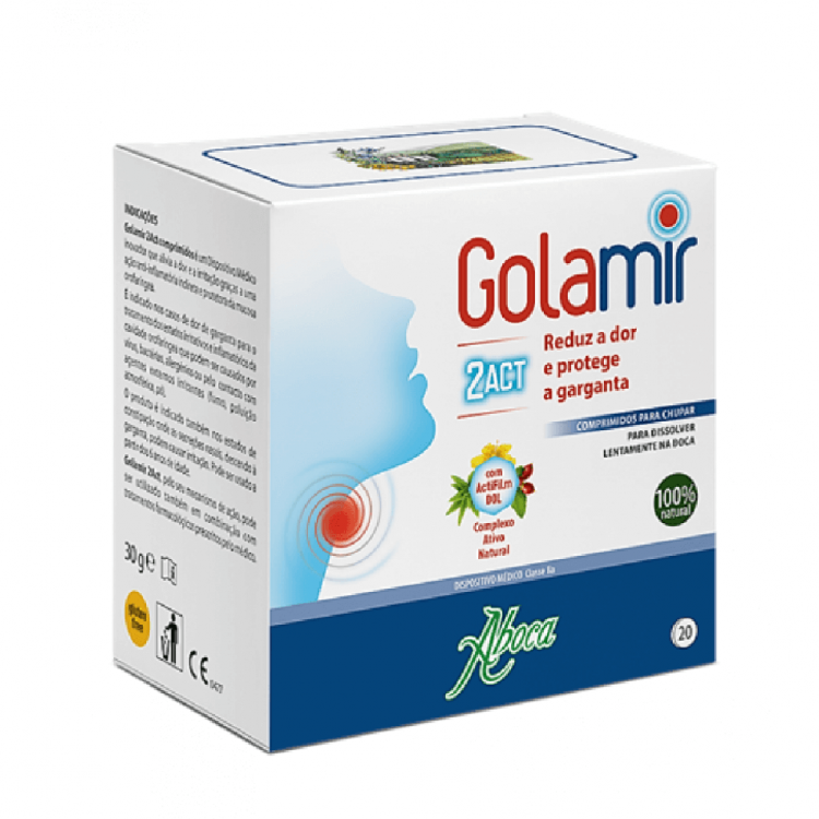 Dispositivo médico que alivia a dor e a irritação protegendo a mucosa orofaríngea, indicado nos casos de dor de garganta para o tratamento dos estados irritativos e inflamatórios da cavidade orofaríngea que podem ser causados por vírus, bactérias, alergénios ou pelo contacto com agentes externos irritantes (fumo, poluição atmosférica, pó). Também pode ser utilizado nos estados de constipação onde as secreções nasais, descendo à garganta, podem causar irritação. Formulação com um complexo molecular vegetal, ActiFilm DOL, composto por taninos, resinas, polissacáridos e flavonoides, que forma uma película com efeito barreira, com dupla ação pois protege a superfície da mucosa e normaliza a mucosa. Graças a este complexo o produto atua contra a dor, o ardor e a dificuldade de deglutição, protegendo a mucosa dos fatores que causam a irritação e os óleos essenciais de Eucalipto e Hortelã proporcionam um efeito refrescante. Tomar 1 comprimido 3 a 4 vezes por dia, deixando-o dissolver-se lentamente na boca. Adequado para ser utilizado em combinação com tratamentos farmacológicos prescritos pelo médico.