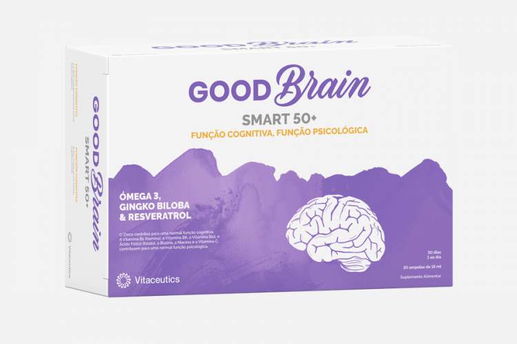 GoodBrain Smart 50+ põe a cabeça a funcionar! FUNÇÃO COGNITIVA - O Zinco contribui para uma normal função cognitiva. FUNÇÃO PSICOLÓGICA - A Vitamina B1 (tiamina), a Vitamina B6, a Vitamina B12, o Ácido Fólico (folato), a Biotina, a Niacina e a Vitamina C, contribuem para uma normal função psicológica. Posologia: 1 ampola ao dia, de preferência antes do pequeno-almoço. Se necessário, poderá tomar até 2 ampolas ao dia. Pode ser diluída em água ou sumo de frutas. COMPOSIÇÃO Por 1 ampola: Extrato Concentrado de Óleo de Peixe Ómega 3 600 mg (contendo 72 mg de DHA e 108 mg de EPA), Geleia Real 150 mg, Fosfatidilserina 20% 250 mg, Ginkgo Biloba (contendo pelo menos 24% de heterósidos flavónicos e 6% de lactonas terpénicas) 60 mg, Resveratrol 20 mg, Vitamina B1 1,1 mg (100% VRN*), Vitamina B2 1,4 mg (100% VRN*), Vitamina B6 1,4 mg (100% VRN*), Vitamina B12 2,5 µg (100% VRN*), Ácido Fólico 200 µg (100% VRN*), Ácido Pantoténico 6 mg (100% VRN*), Biotina 50 µg (100% VRN*), Niacina 16 mg NE (100% VRN*), Vitamina C 80 mg (100% VRN*), Zinco 10 mg (100% VRN*). * Valor de Referência do Nutriente.