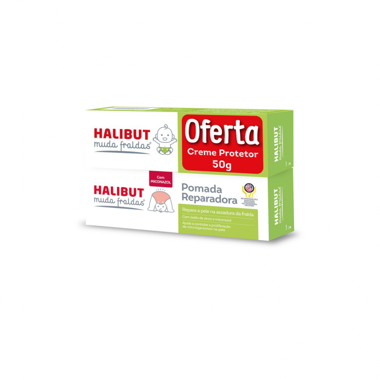 Pack Promocional: 1 embalagem de Halibut Muda Fraldas Pomada Reparadora 50gr e oferta de 1 embalagem de Halibut Muda Fraldas Creme Protetor 50gr.