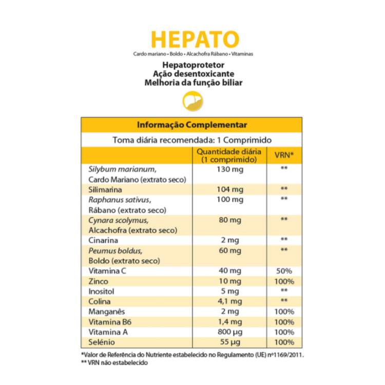 Suplemento alimentar hepatoprotetor que ajuda a eliminar do organismo toxinas prejudiciais e a prevenir a sua entrada. Ajuda ainda a proteger as células do stress oxidativo, impedir a deposição de gordura no fígado, a prevenir lesões inflamatórias e estimula a síntese proteica. Fórmula à base de Cardo Mariano, Boldo, Alcachofra, Rábano, Inositol e Colina. Tomar 1 comprimido por dia.