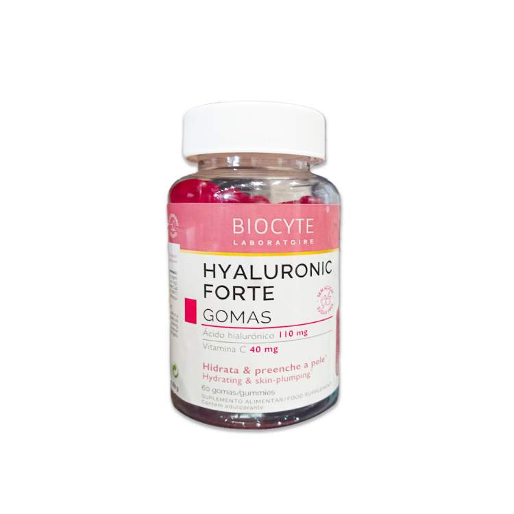 Suplemento alimentar em gomas que ajuda a manter a pele com um aspeto mais jovem e saudável. A sua composição à base de Ácido Hialurónico, Viamina C e B3 permite manter a pele hidratada, prevenindo a perda de água, contribui para a formação de colagénio e manutenção de uma pele saudável. A partir dos 25 a produção natural de Ácido Hialurónico diminui, o que leva à perda de firmeza, tez baça e aparecimento de rugas, daí ser necessário complementar essa perda. Composição (2 gomas): 110gr de Ácido Hialurónico, 16mg de Vitamina B3 e 40mg de Vitamina C. Tomar 2 gomas por dia.