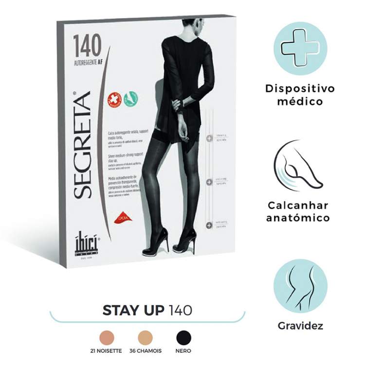 Meias de compressão, da raíz até à coxa, em malha de rede com banda anti-deslizante em silicone autoaderente analérgico, de forma a reduzir o risco de alergias. Ajuda a prevenir e controlar as pernas pesadas e cansadas e em caso de existência de outros sinais de doença venosa crónica.