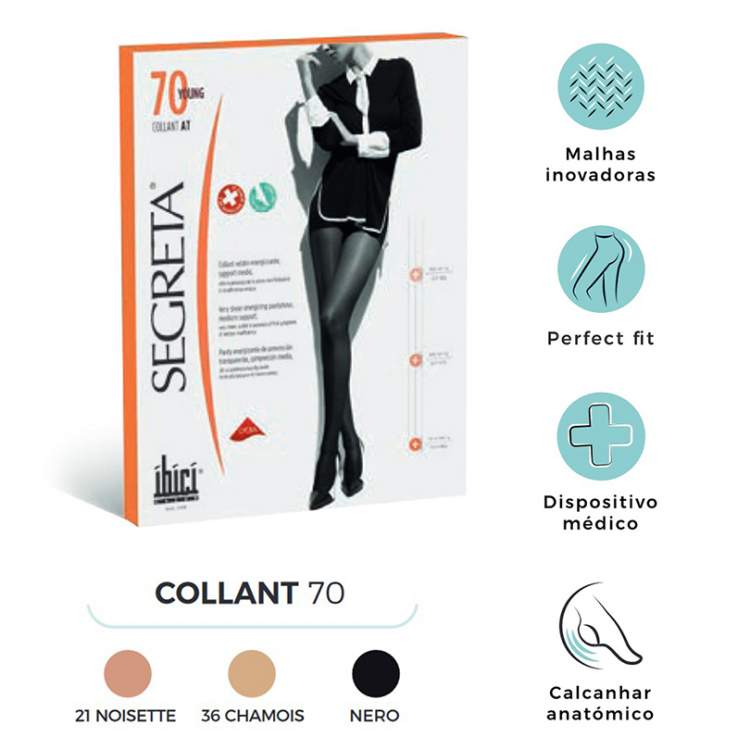 Embalagem com 1 par de collants de densidade da malha 70 e tamanho 2. Cor: Nº 36 Chamois. Compressão: 11/14 mmHg.