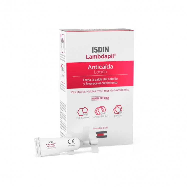 Tratamento da alopécia androgenética e difusa para homens e mulheres. Induz a revitalização do cabelo, travando ou controlando o processo de perda de cabelo e estimulando o crescimento de novos cabelos. Protege do stress oxidativo. Reduz a caspa e a descamação do couro cabeludo. Primeira fórmula patenteada com 3 príncipios ativos que atuam criando um microambiente protetor do folículo piloso. Promove o crescimento de novos cabelos, favorece a fase anagénica e atrasa a apoptose celular graças à melatonina, um poderoso antioxidante que neutraliza os radicais livres. Ativa o folículo piloso, melhorando o aporte de nutrientes graças ao Gingko biloba. Nutre e fortalece. Melhora a estrutura e aumenta a espessura do cabelo graças ao seu conteúdo em Biotina. Modo de utilização: Aplicar o produto com uma massagem suave no couro cabeludo seco ao deitar. Aplicar 1 monodose diária entre 5 a 7 dias por semana durante 3 meses. Para obter melhores resultados, continuar com o tratamento de Lambdapil Antiqueda Loção durante mais 3 meses. Advertências e precauções: ler atentamente o folheto antes de utilizar. Em caso de contacto com os olhos, lavar imediatamente com água abundante. Manter fora do alcance e vista das crianças. Não utilizar o produto se a embalagem estiver danificada ou incorretamente fechada. Não utilizar em caso de intolerância conhecida a qualquer um dos ingredientes do produto. Não utilizar o produto após a data de validade inscrita na embalagem. Em caso de efeitos secundários durante a utilização do produto, suspender de imediato a sua utilização e consultar um médico. Exclusivamente para uso tópico. Não conservar acima de 25° C. As alterações pontuais de temperatura não afetam a qualidade do produto.