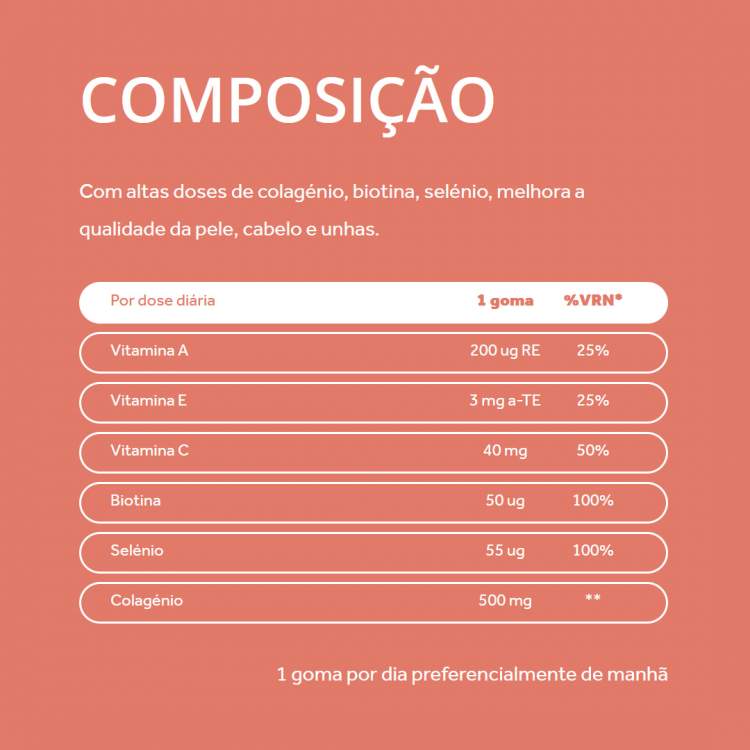 Suplemento alimentar antioxidante com ação anti-envelhecimento e refirmante. Ajuda a prevenir os sinais de envelhecimento, suaviza a formação de rugas e contribui para a normal manutenção da pele e aumento da sua elasticidade e firmeza. Tomar 1 goma por dia.