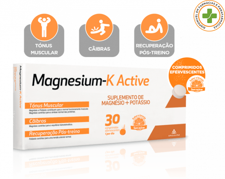 Magnesium-K Active é um suplemento alimentar de Magnésio + Potássio, ideal para treinos de desgaste intenso. O esforço físico intenso pode provocar frequentemente cãibras, uma diminuição do desempenho e uma maior propensão para lesões musculares e das articulações. Magnesium-K Active é o novo suplemento alimentar que associa magnésio e potássio, desenvolvido a pensar em pessoas que praticam desporto de forma intensa e com maior desgaste e que por isso, estão sujeitos a uma forte sudação e maior necessidade de produção de energia. Magnesium-K Active é ainda adequado para quem pretende uma recuperação pós-treino mais rápida. Experimenta já um comprimido por dia e sente a diferença. Magnesium-K Active contribui para um normal funcionamento muscular, síntese normal das proteínas, equil+ibrio hidroeletrolítico, normal metabolismo energético, tensão arterial normal e normal funcionamento do sistema nervoso. A dose diária recomendada de Magnesium-K Active é 1 comprimido, após uma das refeições. Tal como todos os suplementos alimentares, Magnesium-K Active deve ser utilizado como complemento de um regime alimentar variado. A dose de 1 comprimido por dia não deve ser excedida.