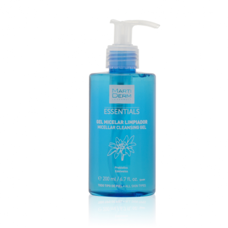 Gel Micelar de Limpeza de uso diário em formato gel da MartiDerm limpa e elimina suavemente e sem ressecar as impurezas e restos de maquilhagem, deixando a pele limpa e hidratada. Formulado com Edelvaisse um antioxidante, com propriedades protetoras e regeneradoras da barreira cutânea e prebióticos para equilibrar a microbiota da pele. Aplicar sobre o rosto húmido, massajar e enxaguar.