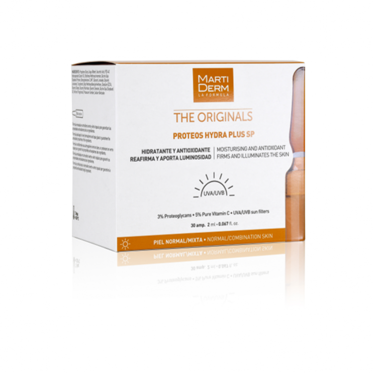 A versão das ampolas Proteos Hydra Plus com proteção solar! Atuam desde a primeira aplicação, hidratando e conferindo luminosidade e suavidade à pele. Além disso, o seu uso diário previne e corrige as rugas e aumenta a firmeza da pele. A sua fórmula encontra-se enriquecida com proteoglicanos e Vitamina C, que proporcionam uma hidratação intensiva, luminosidade, poder antioxidante e elasticidade cutânea. Agitar a ampola, abrir com o sistema "easy open", colocar a ponta doseadora, verter metade do conteúdo na mão e aplicar. Conserve o restante para a próxima aplicação.