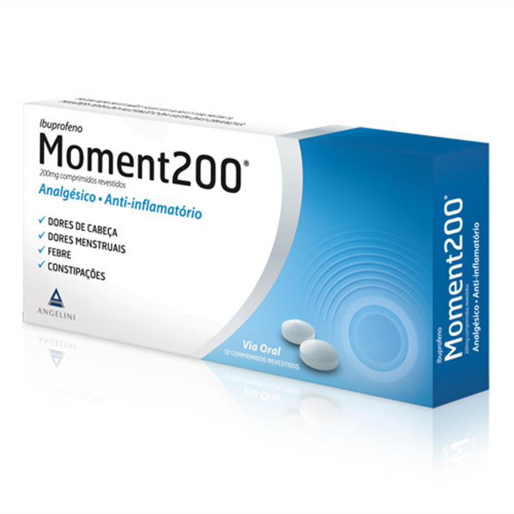 Moment 200mg pertence à categoria dos analgésicos-anti-inflamatórios, isto é, medicamentos que combatem a dor e as inflamações. Indicado no caso de dores de origem e natureza várias (dores de cabeça, de dentes, nevralgias, dores osteo-articulares e musculares, dores menstruais). Coadjuvante no tratamento sintomático de estados febris e gripais. COMPOSIÇÃO: Cada comprimido contém: princípio activo: 200 mg de ibuprofeno. Excipientes: amido de milho, carboximetilamido de sódio, povidona, sílica coiloidal anidra, talco, hidroxipropilcelulose, goma arábica, sacarose, Macrogol 6000, carbonato de magnésio leve, dióxido de titânio.