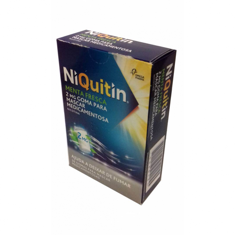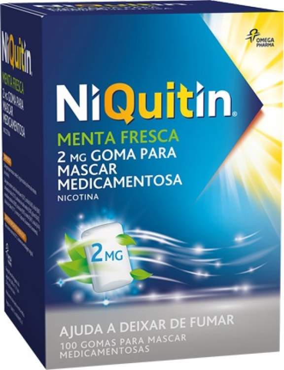 Medicamento não sujeito a receita médica, em forma de gomas para mascar, indicado no tratamento da dependência do tabaco com sabor a menta fresca. Ajuda a aliviar a vontade de fumar, a irritabilidade e mal-estar, para que possa gradualmente parar de fumar. A dosagem das gomas que irá utilizar depender do número de cigarros que fumava antes de iniciar a terapêutica NiQuitin e da fase do tratamento em que está. Cada goma para mascar contém 2mg de Nicotina.