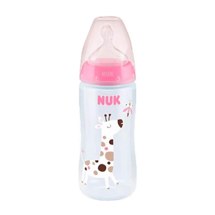 Biberão em poliamida com controlo de temperatura, tetina em silicone e sem BPA. Possui uma tetina flexível e adaptável à boca do bebé, com pequenos orifícios inspirados nos ductos mamários da mama da mãe e que garantem um fluxo de leite suave e natural. A tetina tem uma base de apoio mais larga e flexível permitindo ao bebé controlar o fluxo de leite. A inovadora válvula anti-cólicas torna possível ao bebé beber sem pausas, o que ajuda a prevenir a ingestão de ar. O biberão possui ainda um sistema para verificação da temperatura, se o leite estiver muito quente, o indicador (parece um termómetro) que normalmente está azul, mudará para branco. Idealmente, a comida para bebé deve estar à temperatura corporal (37 ° C = tom azul médio). O controlo de temperatura NUK é uma verificação adicional, verifique sempre a temperatura, colocando algumas gotas no interior do pulso, antes de dar o biberão.