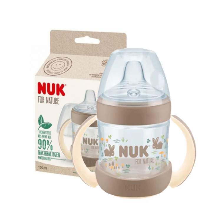 Biberão de aprendizagem feito com mais de 90% de materiais sustentáveis, para uma fácil transição rumo à independência e sem acidentes. As pegas ergonómicas e antiderrapantes ajudam a agarrar de forma segura o biberão. Possui um bocal em silicone macio, equipado com o sistema NUK Air System, para reduzir as cólicas. Ajuda ainda a prevenir acidentes graças ao disco de vedação e tampa protetora. O biberão possui ainda um sistema para verificação da temperatura, se o leite estiver muito quente, o indicador (parece um termómetro) que normalmente está azul, mudará para branco. Idealmente, a comida para bebé deve estar à temperatura corporal (37 ° C = tom azul médio).