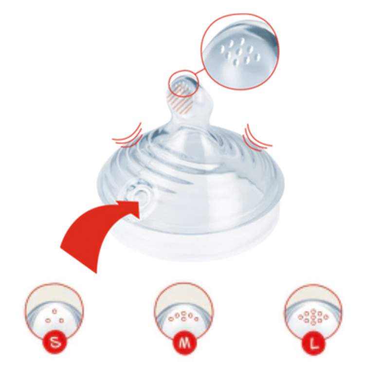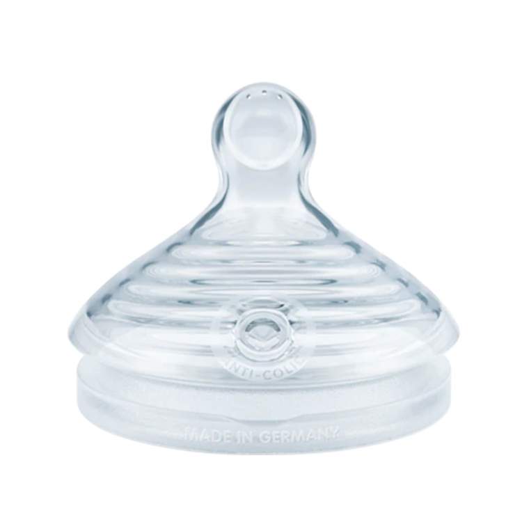 Tetina flexível e adaptável à boca do bebé, com pequenos orifícios, similar ao mamilo da mãe e que garante um fluxo de leite suave e natural. A tetina tem uma base de apoio mais larga e flexível permitindo ao bebé controlar o fluxo de leite. A inovadora válvula anti-cólicas torna possível ao bebé beber sem pausas, o que ajuda a prevenir a ingestão de ar.