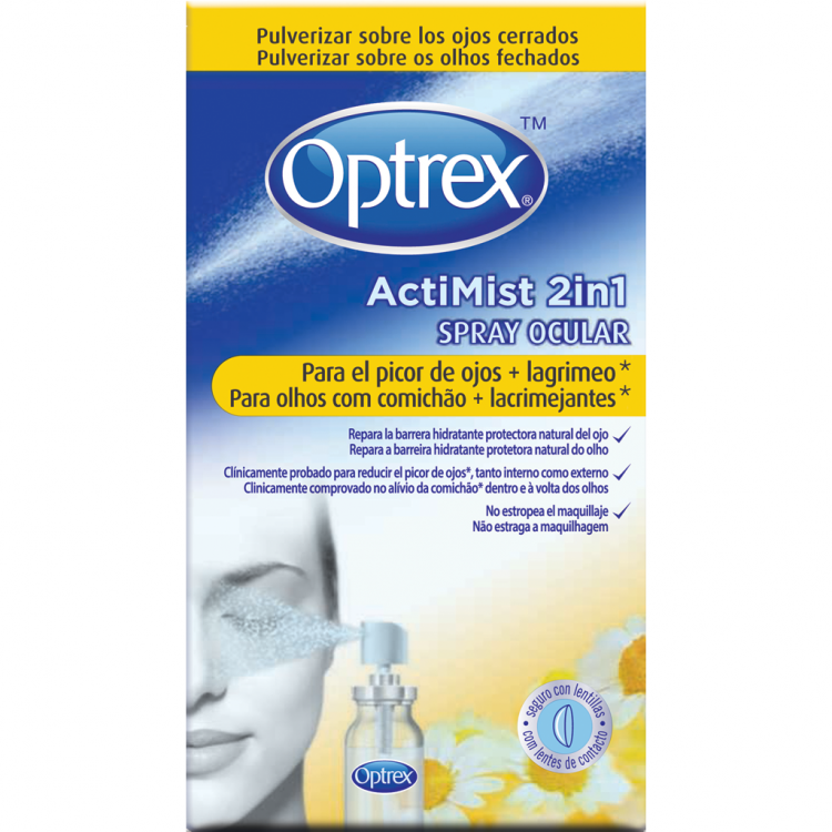 Optrex ActiMist 2in1 Spray Olhos com Comichão e Lacrimejantes repara a barreira hidratante protetora natural do olho. Refresca, acalma e alivia o olho. É rápido e fácil de utilizar, não havendo a necessidade de tocar nos olhos. Alivia a comichão que pode estar associada a alergias ou outros fatores ambientais.