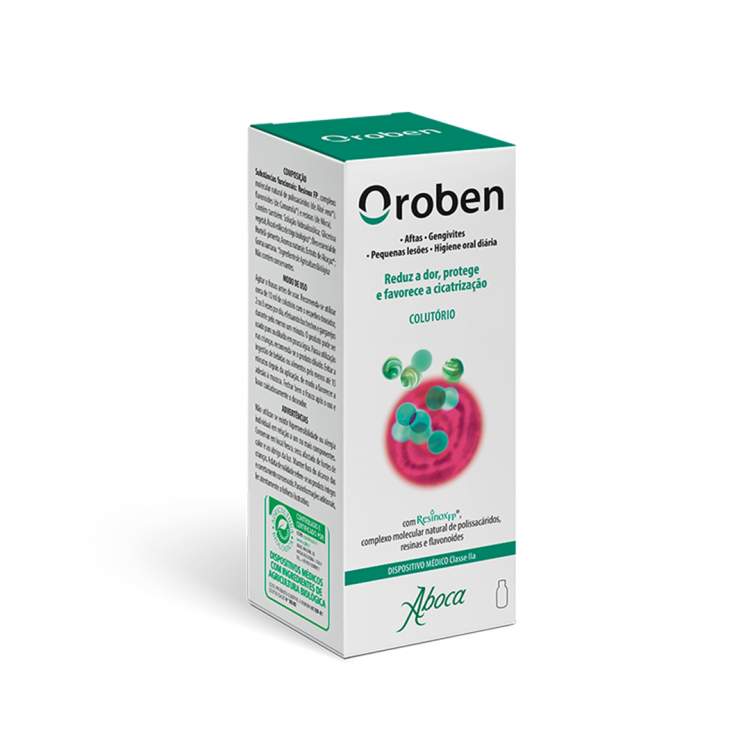 OroBen Gel oral é um produto que, graças à formação de uma película protetora, reduz a dor e favorece a cura de aftas, estomatites aftosas recorrentes, gengivas inflamadas e pequenas lesões da boca devido, por exemplo, a tratamentos dentários ou ao uso de aparelhos e próteses dentárias. OroBen Gel oral atua graças a Resinox FP, um complexo molecular composto por polissacáridos, resinas e flavonoides que criam na mucosa uma barreira com ação protetora-hidratante e antioxidante. A película protetora limita o contacto com agentes externos, patogénicos ou irritantes que contrariam o processo natural de cicatrização e regeneração dos tecidos. OroBen Colutório permite alcançar todas as partes da cavidade oral, através de bochechos e gargarejos, permite a remoção de agentes irritantes e favorece assim o controlo do microambiente, a higiene e a proteção da boca. Contém óleo essencial de Hortelã para uma agradável sensação de frescura na boca e útil também para reduzir a halitose que muitas vezes acompanha as gengivites. Agitar o frasco antes de usar. Recomenda-se utilizar cerca de 10 ml de colutório com o respetivo doseador, 2 ou 3 vezes por dia, efetuando bochechos e gargarejos durante pelo menos um minuto. O produto pode ser usado puro ou diluído em pouca água. Para a utilização nas crianças, recomenda-se o produto diluído. Evitar a ingestão de bebidas ou alimentos pelo menos até 15 minutos depois da aplicação, de modo a favorecer a adesão à mucosa.