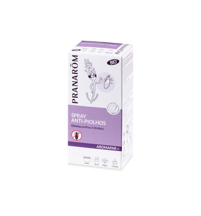 À base de extratos de óleo de coco e de óleo vegetal de caroço de alperce biológicos*, o SPRAY ANTIPIOLHOS AROMAPOUX BIO* atua mecanicamente bloqueando os orifícios respiratórios dos piolhos e destrói o invólucro da lêndea. Os óleos essenciais biológicos* de Árvore do chá, Lavandim, anis e Ylang-ylang completam esta fórmula sem inseticida neurotóxico, eficaz para a eliminação total dos piolhos e das lêndeas. CONSELHOS DE UTILIZAÇÃO: 1 aplicação por dia durante 2 a 3 dias até ao desaparecimento dos piolhos e lêndeas: a utilização é simples, mas deve ser realizada com rigor. Em cabelo seco, pulverizar a 10 cm, risca por risca no couro cabeludo e nos fios de cabelo em quantidade suficiente para cobrir a totalidade do cabelo que deve parecer molhado. Deixar atuar durante 15 minutos, no mínimo. Lavar de seguida o cabelo com um champô para usos frequentes. Passar o pente antipiolhos metodicamente para remover as lêndeas e os piolhos mortos. Repetir a aplicação do spray 7 dias após a primeira utilização. INGREDIENTES: Coco alkanes-coco-caprylate/caprate; Prunus armeniaca Kernel oil* (Alperce), Cocos nucifera oil* (Coco); Melaleuca alternifolia leaf oil* (Árvore do chá), Lavandula hybrida oil* (Lavandim), Illicium verum fruit oil* (Anis estrelado), Cananga odorata flower oil* (Ylang-ylang).
