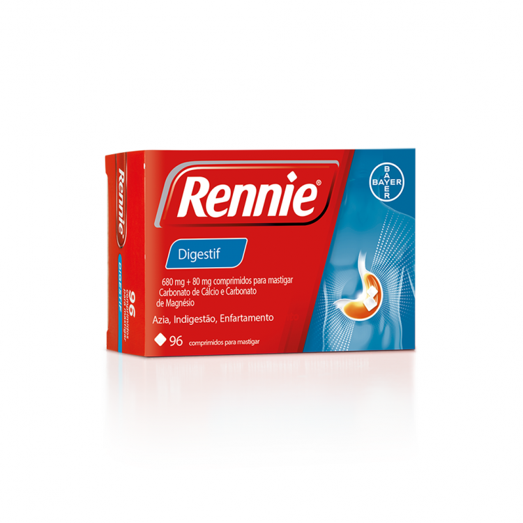 Os comprimidos para mastigar Rennie® Digestif são um medicamento com ação antiácida que, com um sabor refrescante, neutralizam o ácido em excesso no seu estômago, aliviando os sintomas de azia e indigestão de forma rápida. Rennie Digestif contém duas substâncias que existem na natureza: o carbonato de cálcio e o carbonato de magnésio. Em conjunto, atuam no estômago e transformam o excesso de ácido em água e outras substâncias naturais. Estas substâncias atuam diretamente no esófago e no estômago, antes de serem eliminadas pelo organismo. As embalagens maiores de Rennie são ideais para quem sofre de azia ou indigestão com frequência. Os comprimidos para mastigar têm um sabor agradável a menta e podem ser tomados de forma simples e discreta.