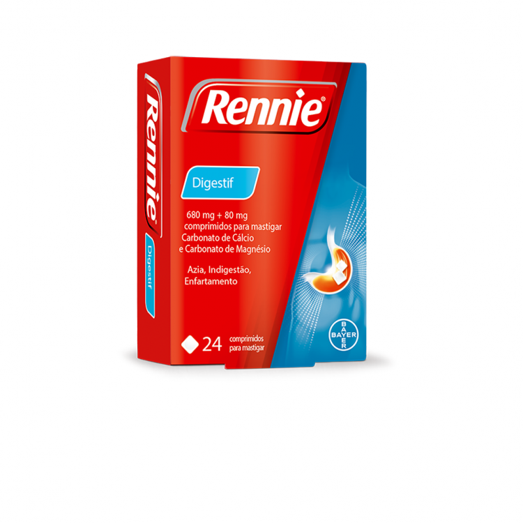 s comprimidos para mastigar Rennie® Digestif 24 são um medicamento com ação antiácida com um refrescante sabor a menta, que neutralizam ácido em excesso do estômago, aliviando rapidamente os sintomas de azia e indigestão. Rennie não recorre a fórmulas químicas complexas para acabar com o seu desconforto - a simplicidade é a chave. Rennie Digestif 24 contém duas substâncias que existem na natureza, o carbonato de cálcio e o carbonato de magnésio, que atuam localmente no estômago, neutralizando o excesso de ácido e transformando-o em água e outras substâncias naturais. Estas substâncias atuam diretamente no esófago e no estômago e são depois eliminadas pelo organismo. Os comprimidos para mastigar têm um sabor agradável a menta.