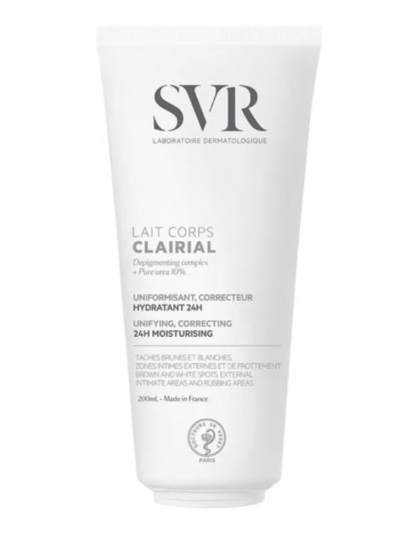 Leite corporal uniformizador antimanchas que corrige todos os tipos de manchas escuras e claras causadas pelo sol, induzidas pós-inflamação (pós-acne, depilação, laser) ou por fricção, em apenas 1 mês. Enriquecido com um complexo despigmentante para uniformizar as manchas escuras e claras, assim como zonas de fricção e ureia para uma hidratação imediata de 24 horas. Formulado com 4% de um Complexo Despigmentante e 10% de Ureia pura.